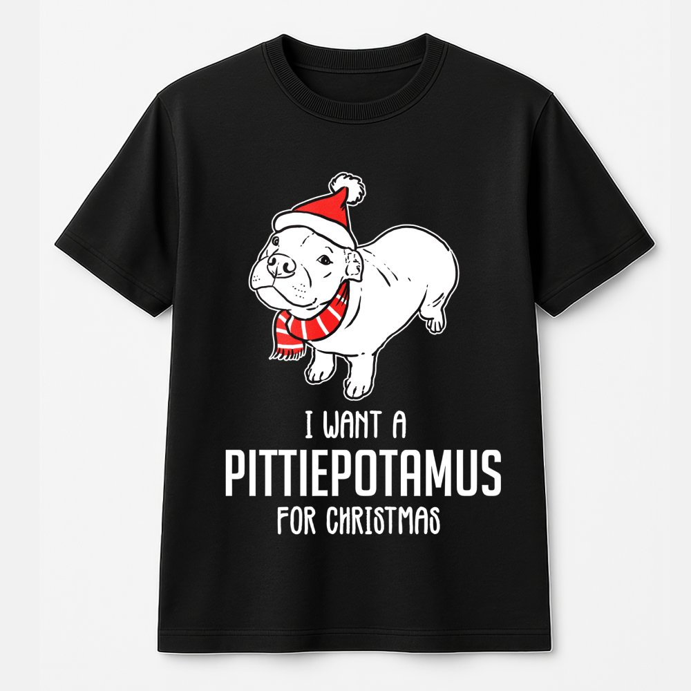 I Want A Pittiepotamus For Christmas With Christmas Pitbull Dog Wearing Santa Hat And Scarf T-Shirt