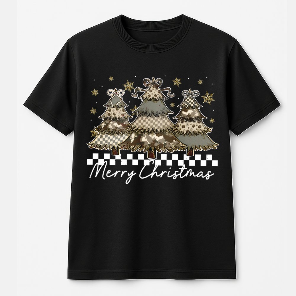 Merry Christmas Camo Xmas Tree Brushstroke Cozy T-Shirt, Preppy Camo Coquette Bow Girly Xmas T-Shirt